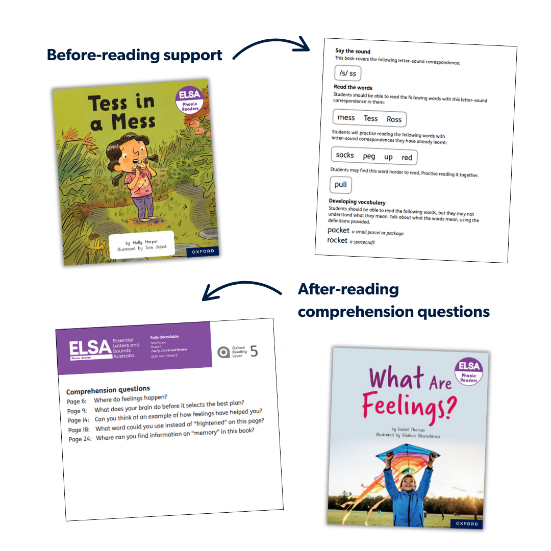 The Essential Letters and Sounds Australia Foundation and Year 1 Pack provides decodable readers perfectly matched to the ELSA Scope & Sequence for every week of the program. Students will read one book in pairs during the explicit teaching weeks (one book between two students), and two or more books in pairs across each review week (one book between two students).