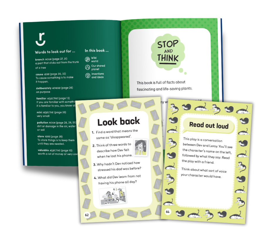 Rise books include a number of touch points where students get the opportunity to engage in the text meaningfully. Before reading, students can see a vocabaulary list with potentially tricky words, along with their definitions and location in the book. There is also a "Stop and Think' page to encourage readers to think about the themes and storyline in the book before they start reading, to help them draw on prior knowledge.